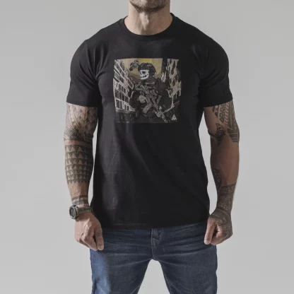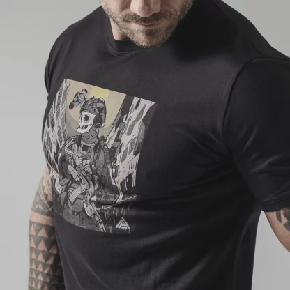 Футболка DA Skeleton – это смелый уличный стиль с тактическим уклоном. Готовый к бою скелет на фоне разрушенного города создает постапокалиптическую атмосферу с мрачной эстетикой – идеально подходит для стрельбища, тренировок или повседневных операций.